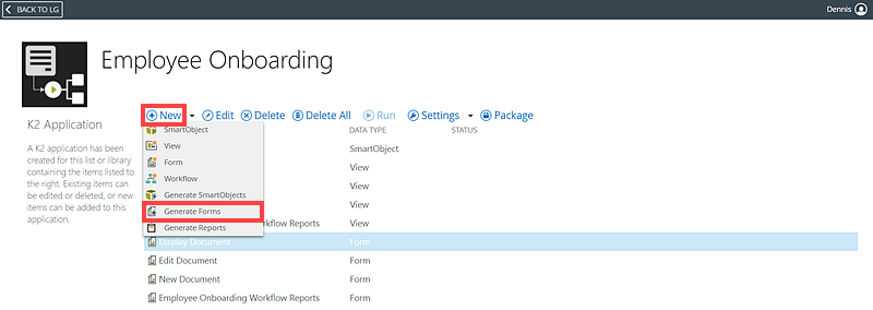 - Click (+) New and then select the Generate Forms item to create default New, Edit, and Display Forms and Views.