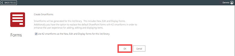 If you have already created a K2 Application for a List/Library, you can use the Generate Forms menu option to create or re-generate SmartForms for the Application and decide whether to use SmartForms as the New, Edit and Display Forms for the List/Library. If the List/Library definition changes (for example, a column is added to the List), you will need to re-generate the SmartObjects, Forms and Views to discover and expose these changes in the Application. For additional information on this, see Changes to a SharePoint List or Library Structure.