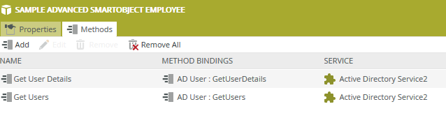 The Methods tab only displays when you are working with an Advanced SmartObject. You can use the Methods tab to view, add, edit and delete the SmartObject methods. You can also configure the underlying service object methods that are bound to the SmartObject's methods, and edit the mappings between the service object method's parameters, input properties and return properties, and the SmartObject method parameters or the SmartObject's properties.