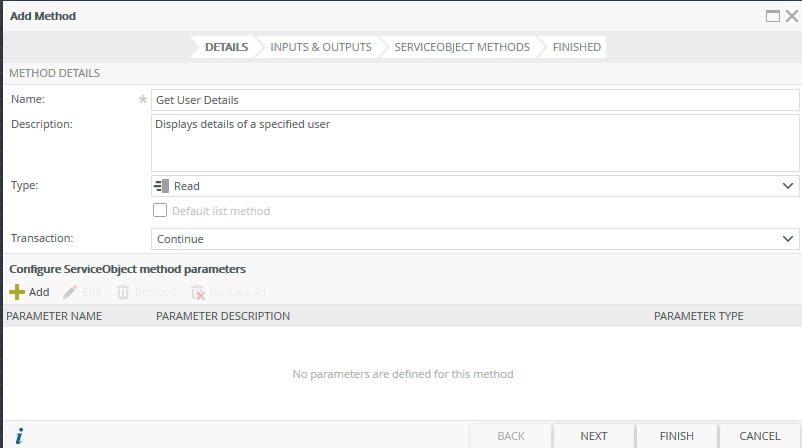 Configure ServiceObject method parameters | Use this section to define method parameters. See the Configure Method Parameters section |
