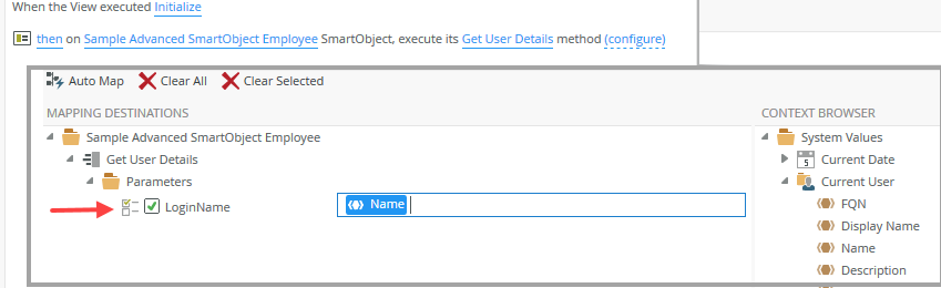 When using SmartForms, SmartObject method parameters are reflected in the Mapping Destinations of the SmartObject method action.