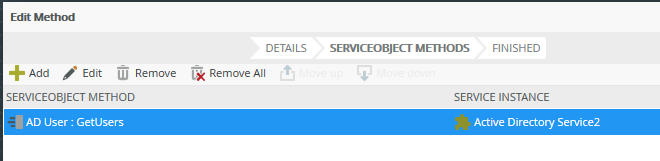 Click OK. In this example you add the Active Directory 2 GetUsers method and bindings to then be configured in the method link.