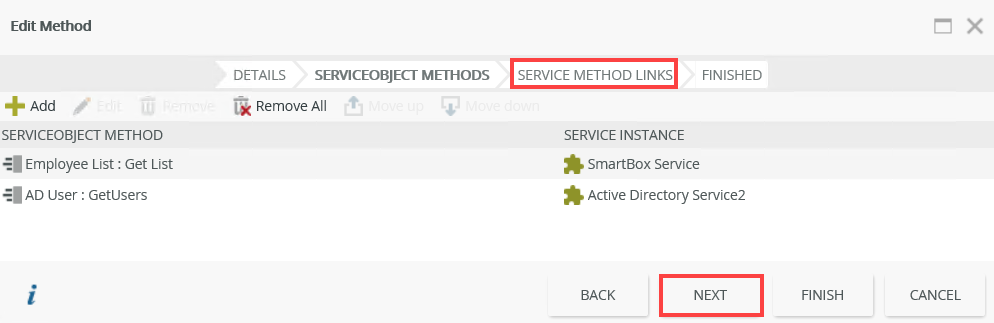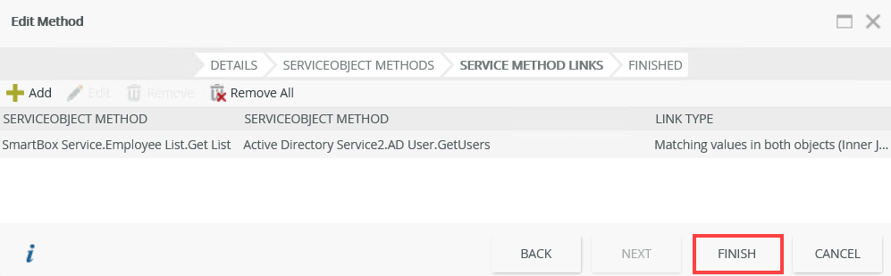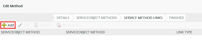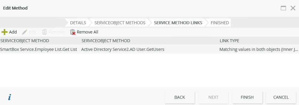 On the Service Method Links page you add and configure the method link. Click Add to create the link between the Employee and AD User methods.