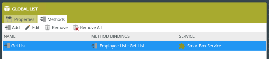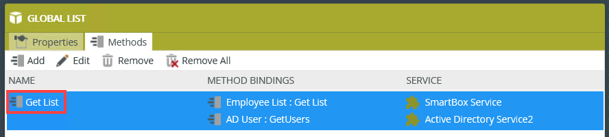 Create an advanced SmartObject called Global List. This advanced SmartObject is where you add the methods and configure the method links. From the Methods tab. Click Add and add the Employee List Get List Service Object Method. Select the method and click Edit.