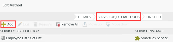 The ServiceObject Methods screen displays the service object methods that are configured for the current SmartObject method. You can add more than one service object method to create Composite SmartObjects.