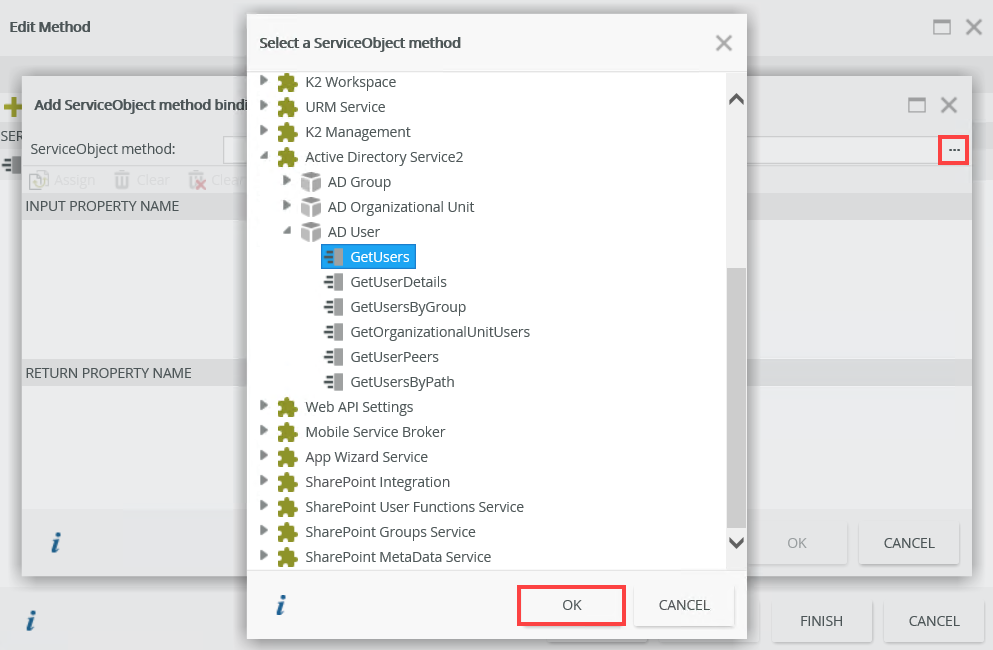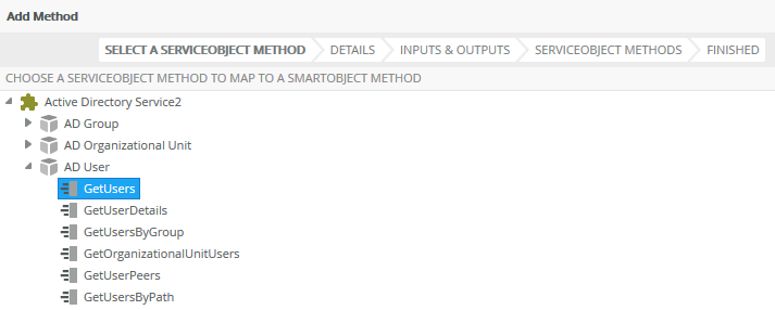 From the Add ServiceObject method bindings screen, select the ellipsis and browse to Active Directory Service 2 > AD Users. Select the GetUsers method. Click OK.