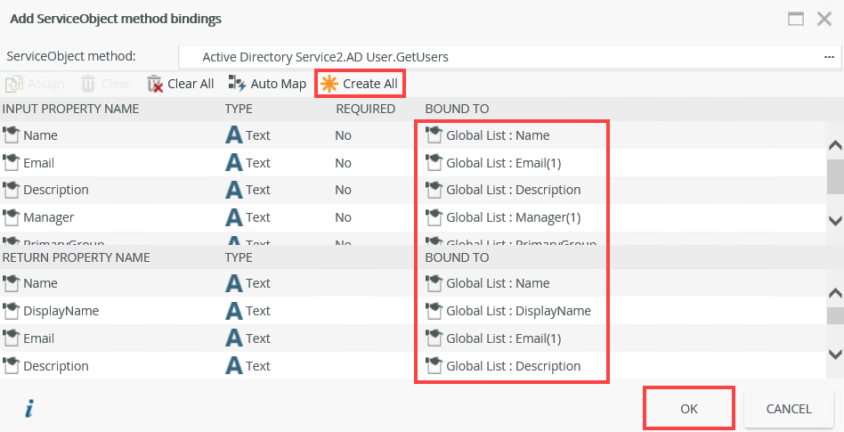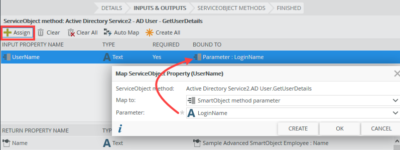If there are no properties for the SmartObject, you must create the properties as part of the Assign step, or you can click Create All to automatically create SmartObject properties for all the service object properties, and K2 will also auto-map the properties once they are created.