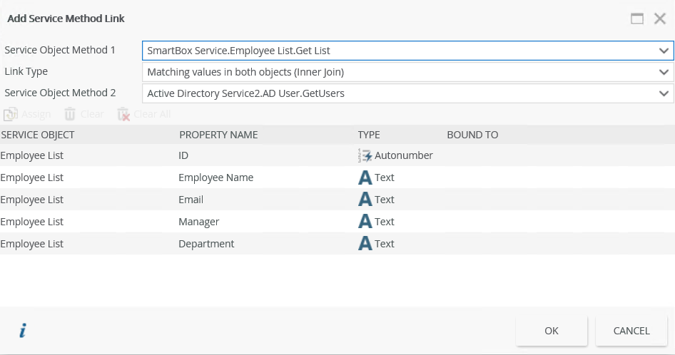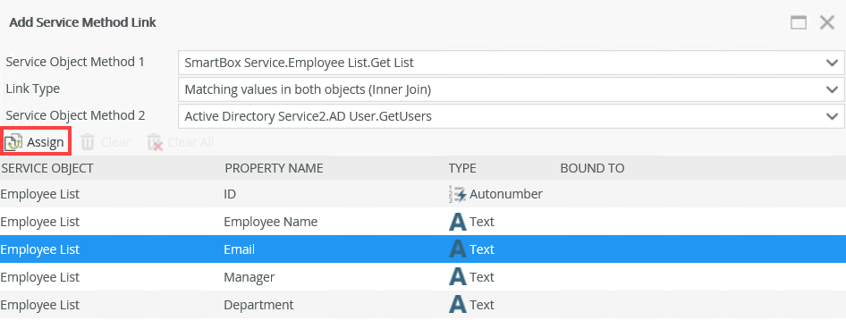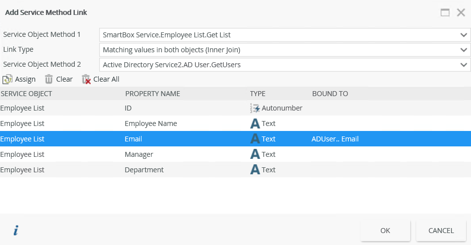 The example have two service objects namely the Employee List (contains employee details including an email address) and Active Directory 2 (contains user details including an email address). The service method for both these objects is the List method. You create an advanced SmartObject with a service method link configured between the service objects.