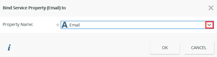On the Bind Service Property screen, select a property to bind to. In this example, the Property Name menu contains properties from Service Object Method 2 which is the AD User Service Object. Select Email and click OK.