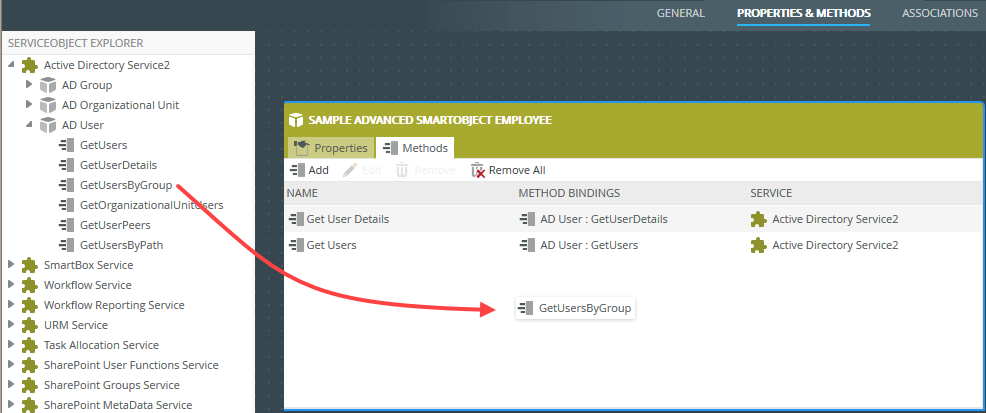 Click on Add to launch the wizard to add a new method, and then select the service object method you want to add, or alternatively drag and drop a service object method from the ServiceObject Explorer panel into the Methods tab.
