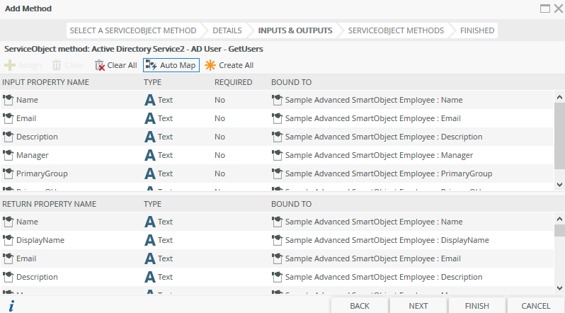The input and return properties of the service object method are displayed on this page. You can map service object properties individually by selecting a property and then clicking the Assignbutton, or you can clickAuto MaporCreate Allbuttons to let K2 automatically map all current SmartObject properties to the service object method properties, using the property names to auto-map where possible and creating new properties where needed. See Advanced SmartObjects: Properties for more on defining and creating properties.