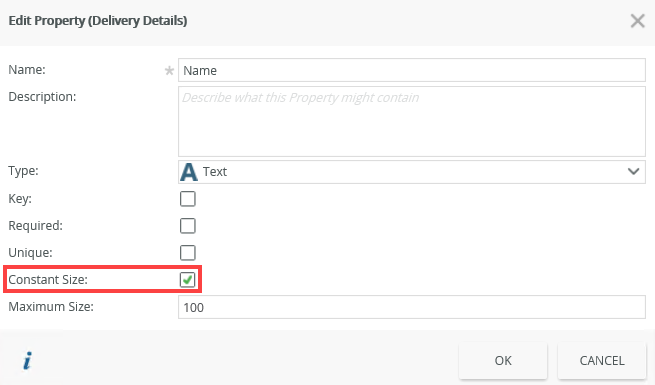 Constant Size | Text | Use this to specify if a text field has a constant size. Check this check box if the information entered into this field has a fixed number of characters, such as a social security number.