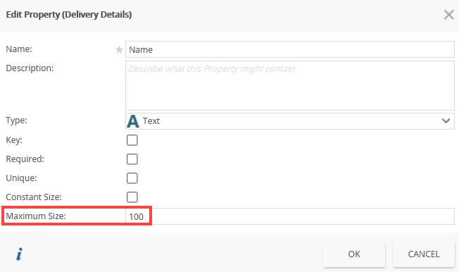 Maximum Size | Text | Use this to specify the maximum length of text you enter into the property. For example, if you type 100 into this field, the most characters stored in the database are 100. You can increase the maximum size value even if your SmartObject contains data.
