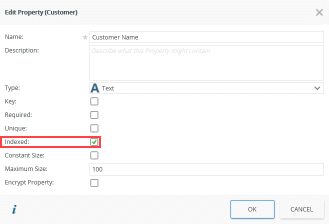 This setting is disabled when: ![]() | Check the check box to create an index for this property. |