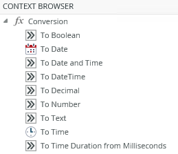To Date and Time | Converts a value to a Date and Time data type. | Text, DateTime | Input Value: "2017/02/02 05:05:05 AM" Result: 2017/02/02 05:05:05 AM |