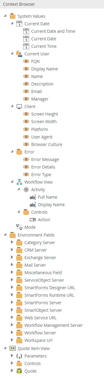 [Quote] | The fields of the SmartObject linked to the view or form. Use the SmartObject fields to set items such as a form parameter | |