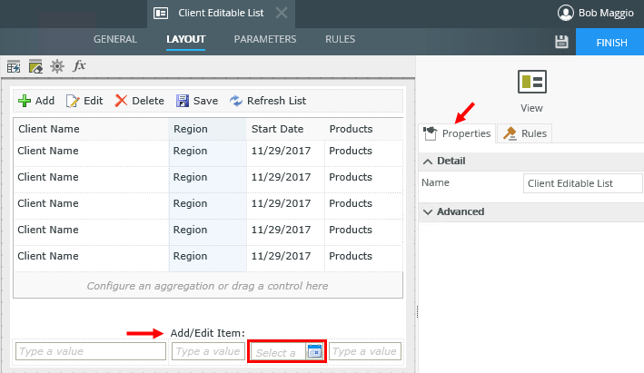 When you create a List view, you can select to Enable list editing. This turns a regular List view into an Editable List view. An Editable List view is the same as the List View Layout with options turned on in the Add/Edit Item section of the view, which is how records in the table are represented when they're in an editable state. Each control represents the data type of the control listed in the column. You can configure properties by selecting the control and changing the configuration in the Properties panel. In the example, the calendar control is configured for editing the Start Date column.