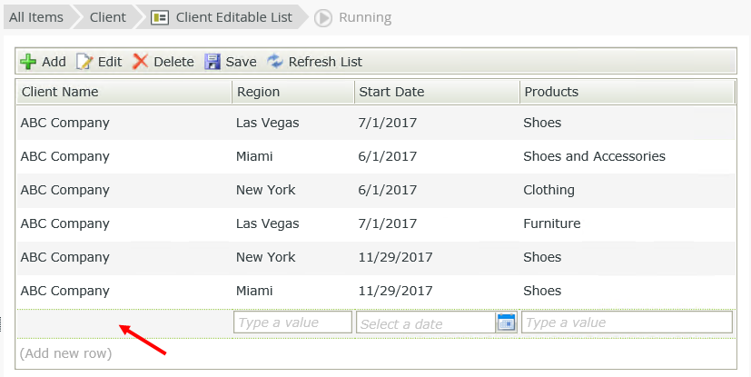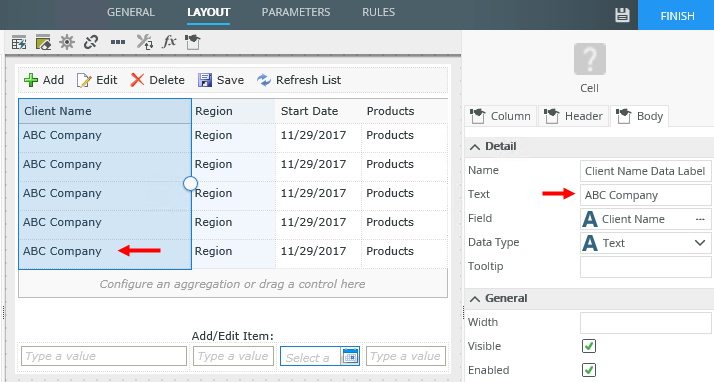 - You can use bound and unbound controls in all drop zones. The Add/Edit Item row supports all types of controls, while the body section supports the same controls as per the List view (see above).