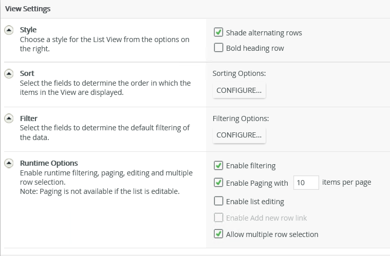 You can enable filtering, paging, list editing, and multiple row selection from this section. When you select to enable filtering, a Quick Search is added to your List view. The All fields item shows all visible