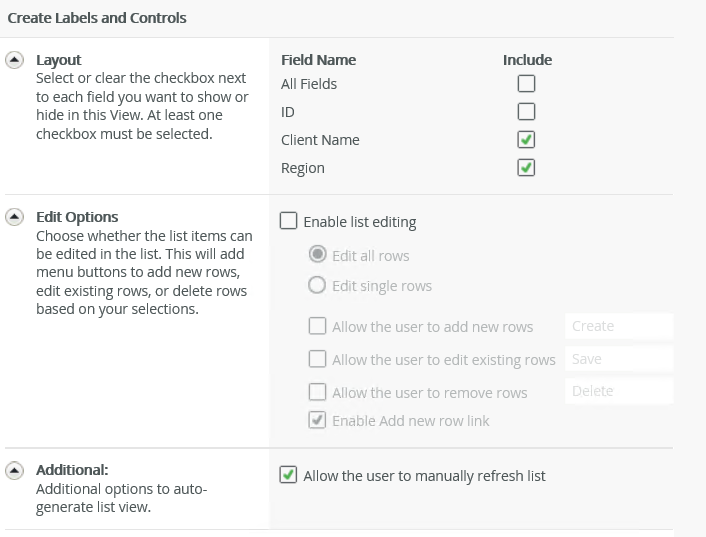 Selecting the first option, Create Labels and Controls, allows you to specify the details for creating the layout and other options including making the list view editable. Clicking OK automatically generates the view.