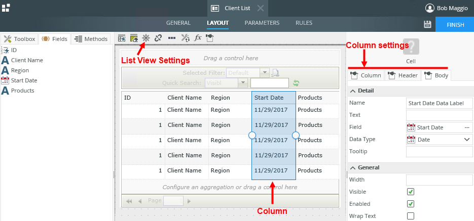 See the Column Settings topic for information on how to configure the Column, Header, and Body sections of a List view.
