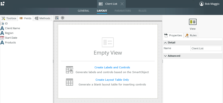 You have two options when the view is empty: You can Create Labels and Controls based on the SmartObject you selected on the General tab, or generate a blank layout table for inserting controls. If you want to get back to an empty view, click the Clear canvas button in the toolbar.