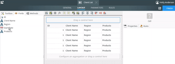 Click Create Layout Table Only to design the view by dragging fields, methods and controls onto the canvas. You can also drag fields and controls (available in the Toolbox) directly onto the canvas when creating a new view. It is not necessary to first configure the layout.