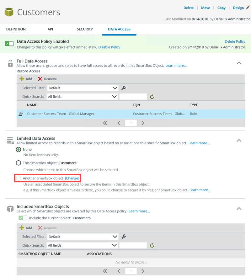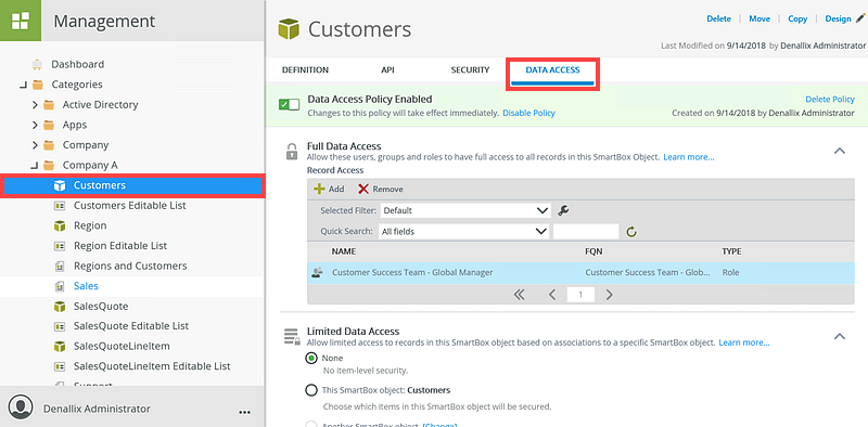 Notice that Full Data Access is enabled for Anthony (a member of the Customer Success Team - Global Manager role), as he is the Global Customer Success Manager. You want to limit the data that Bob is able to access on the Customers SmartBox SmartObject. Data access policies can contain both Full Data Access and Limited Data Access settings.
