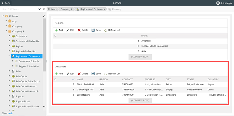 - When Bob runs the Regions and Customers form, which contains data from the Customers SmartObjects, he only sees data for the Asia region.