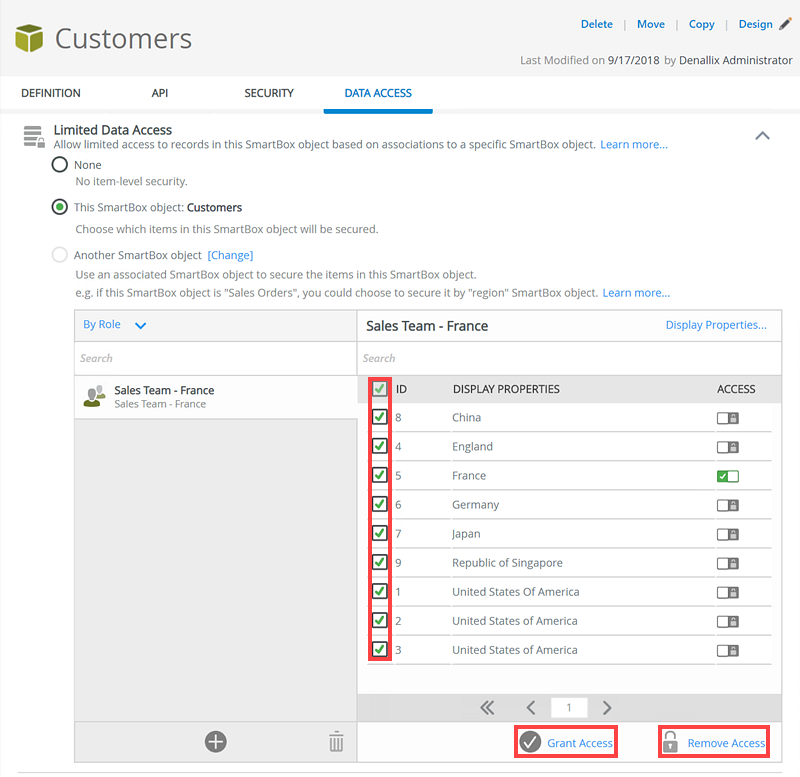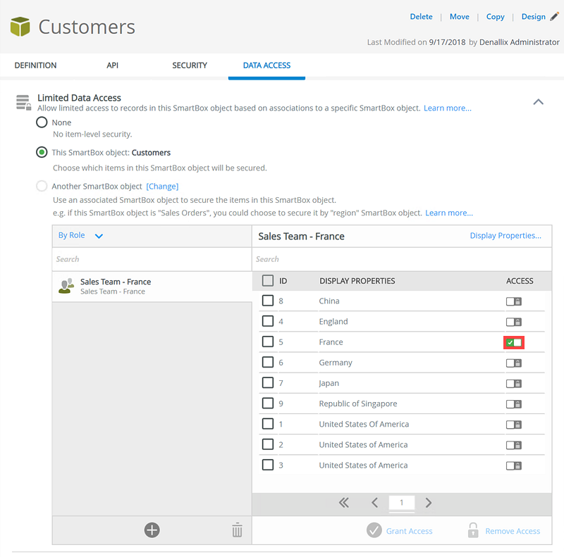 - On the By Role view, give Sales Team - France role access to France. This means the Sales Team - France only sees Customers who's region is France in the Customers SmartObject at runtime.