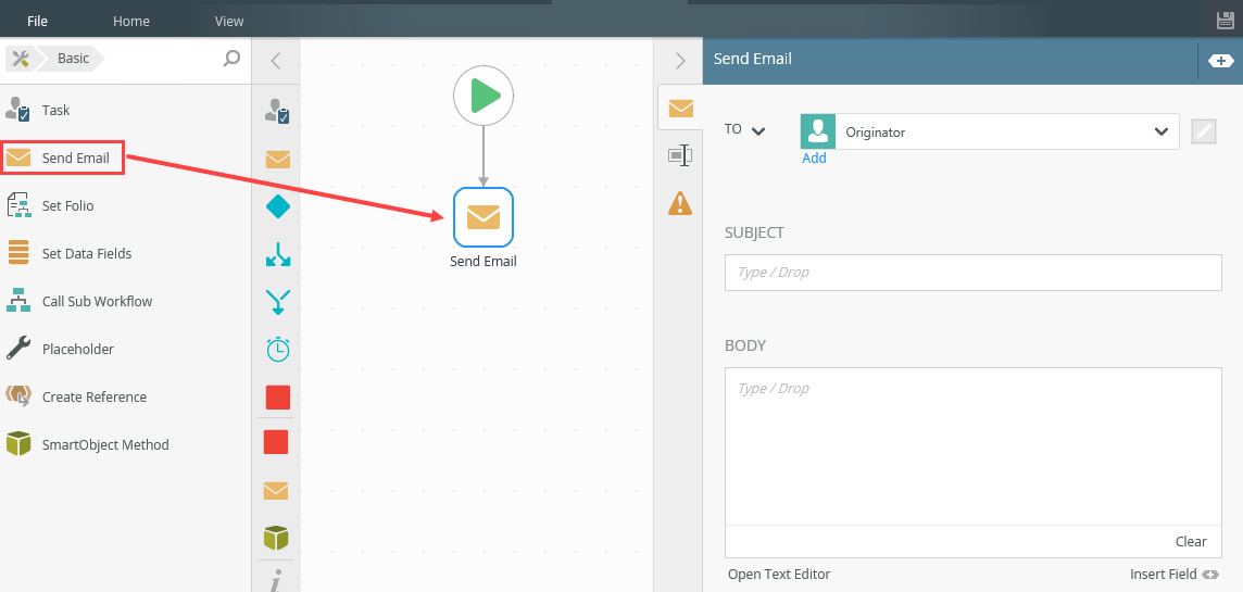 - From the Toolbox, click the Basic category, and then drag the Send Email step onto the canvas.