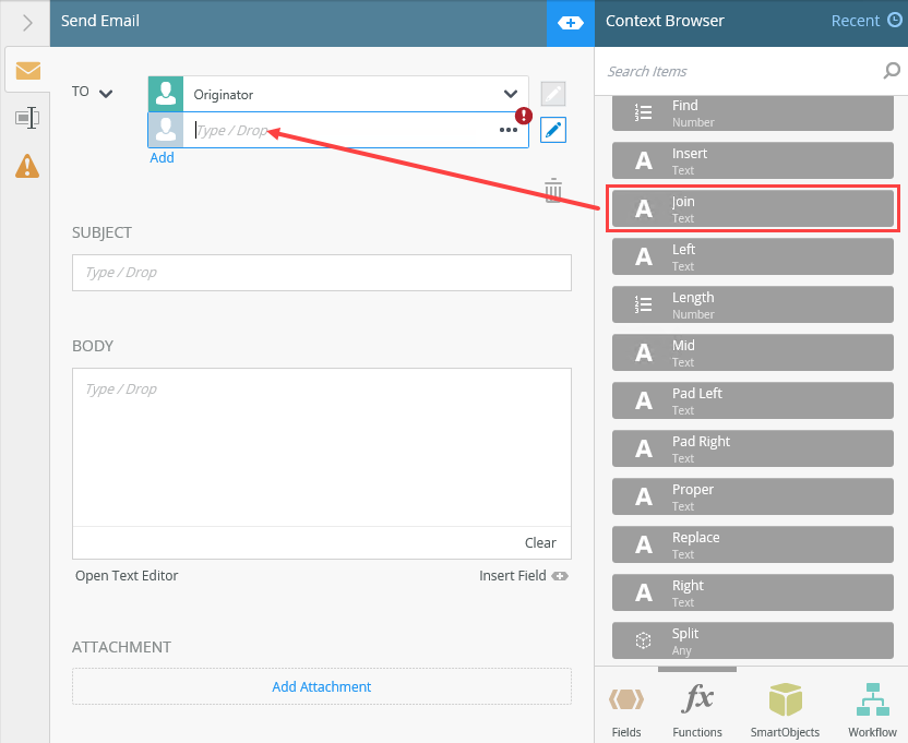 - Configure the To field by dragging the Join function (found in the Text section) from the Context Browser into this field.