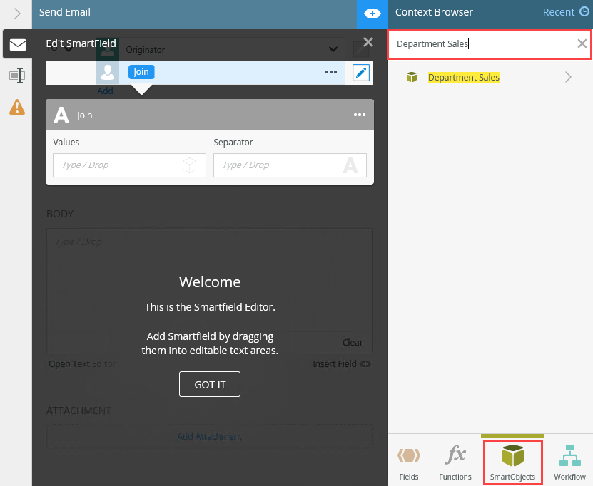 - The Smartfield Composer shows. From the SmartObjects section, enter Department Sales in the search area to locate your SmartObject.