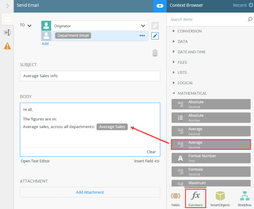 - To add the average sales across all departments in the body of the email, drag the Average function from the Function section (found in the Mathematical section) from the Context Browser into this field.