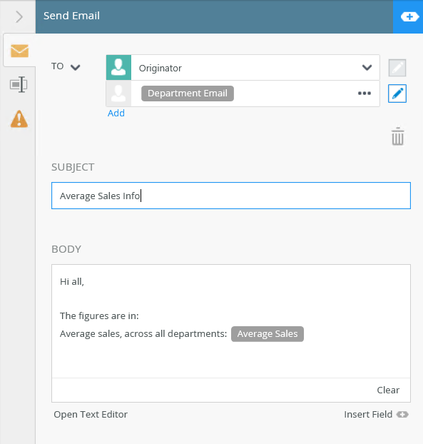 - Click X to close the Smartfield Composer. The configuration in the email body is as follows: