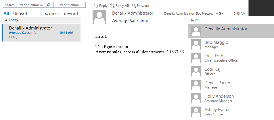 - From K2 Management, start an instance of the workflow. At runtime, the workflow calls the SmartObject, collects and calculates data, and then sends an email every address. In this example, the body of the email contains the average sales figure across departments which is 11833.33.