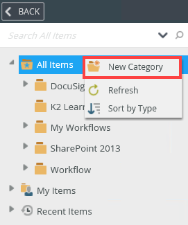 - From the K2 Designer, locate and select the All Items folder. Right click and select New Category.