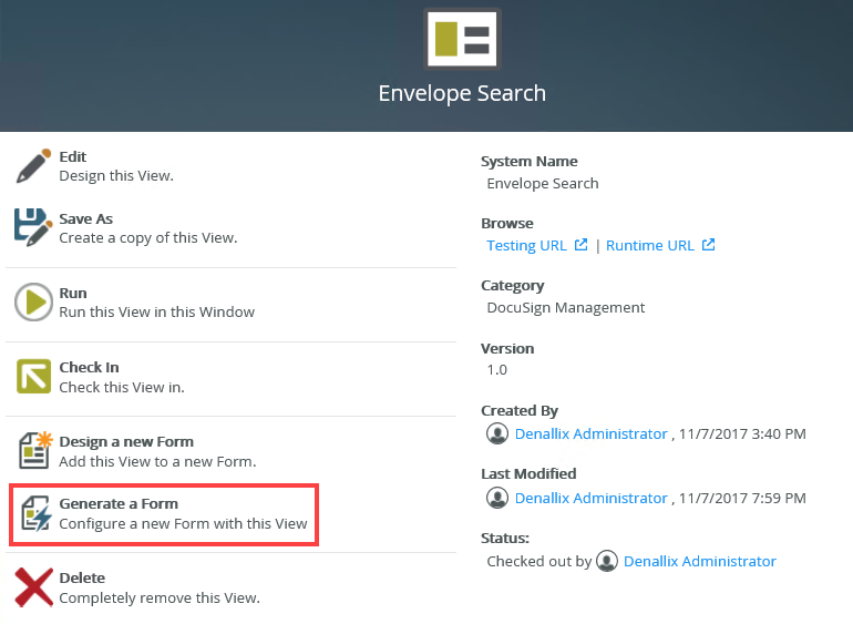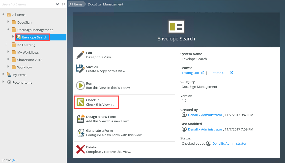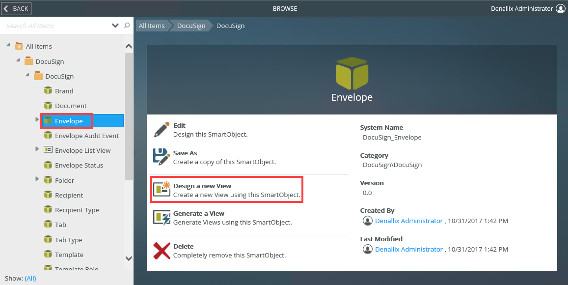 - Locate the Envelope SmartObject within the DocuSign category. Select Envelope and click the Design a new View option.