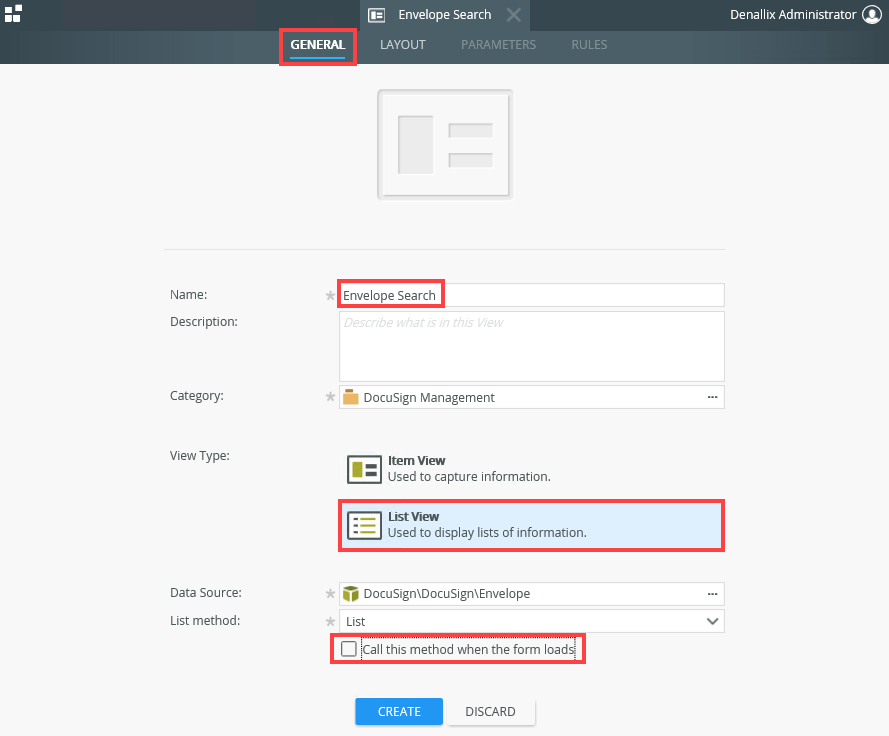 - On the General tab, name the view Envelope Search and ensure that you select the DocuSign Management category. Select the List View view type and uncheck the Call this method when the form loads check box.