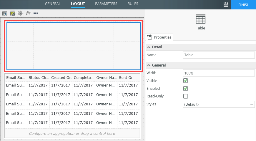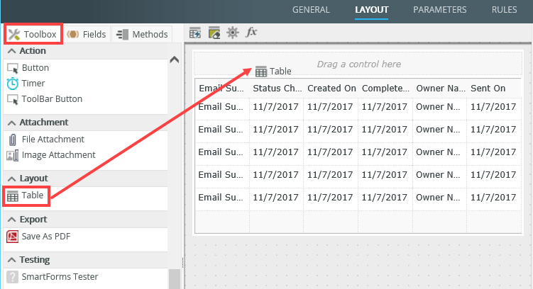 - Drag a Table control onto the canvas. The control is available in the Layout section of the Toolbox.