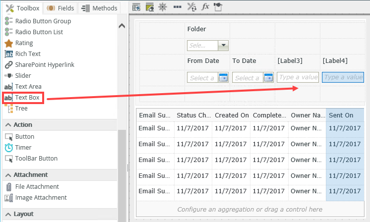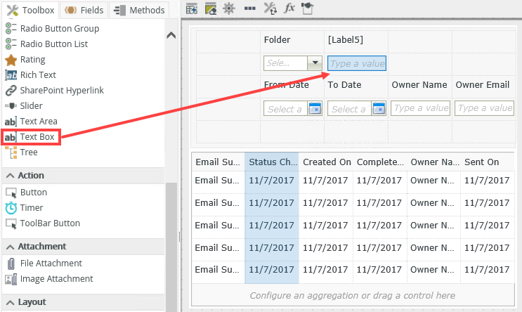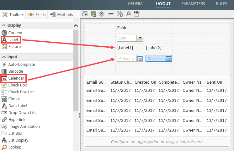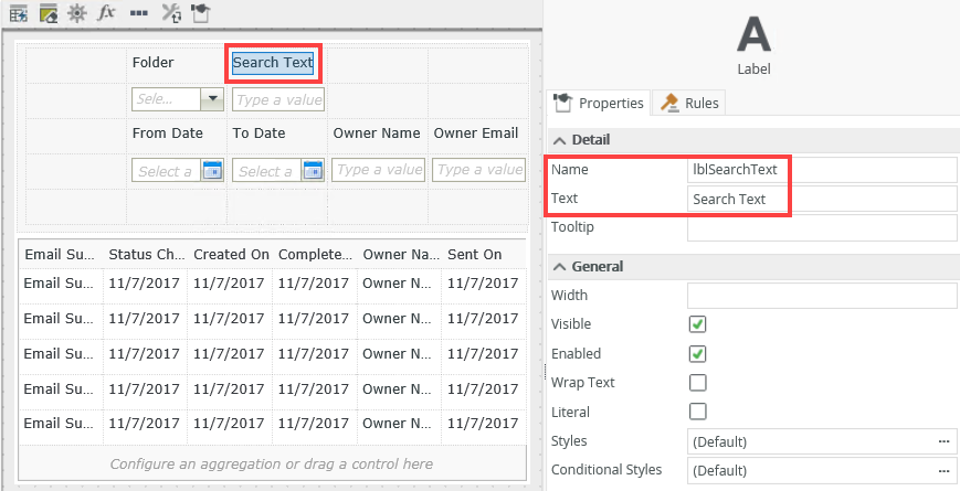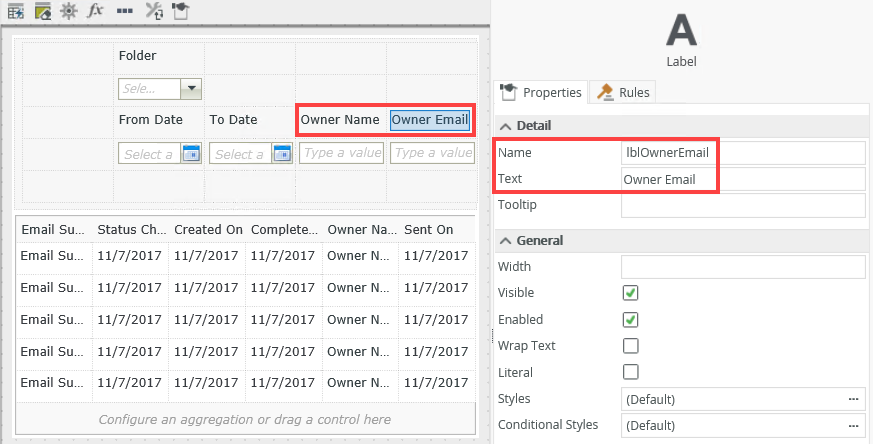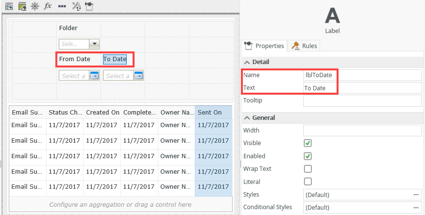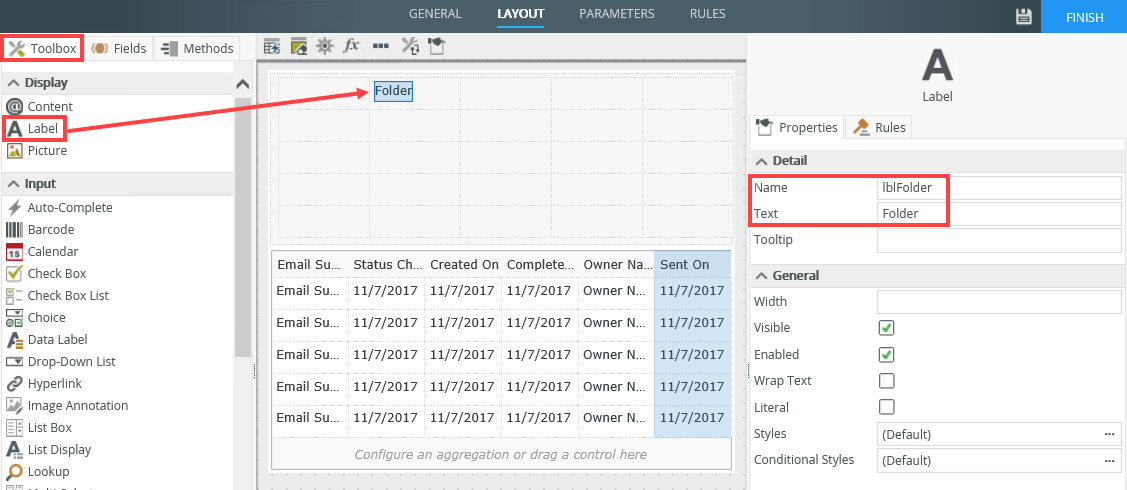 - Drag a Label control onto the canvas. The control is available in the Display section of the Toolbox. Change the label name to lblFolder (in the Name field) and Folder (in the Text field).