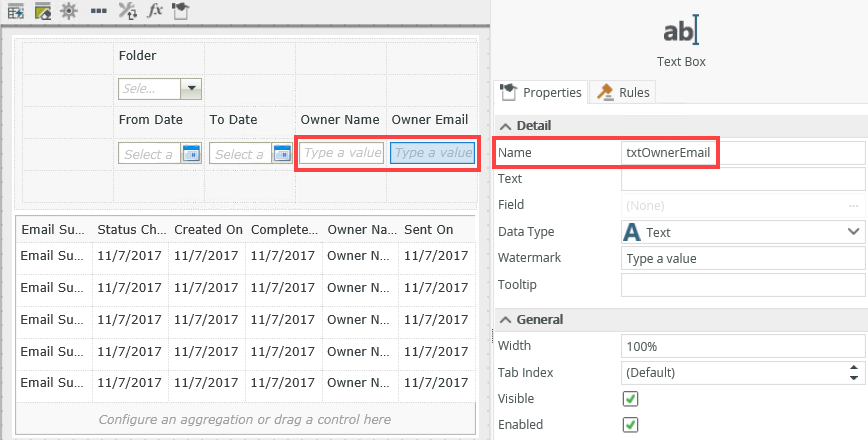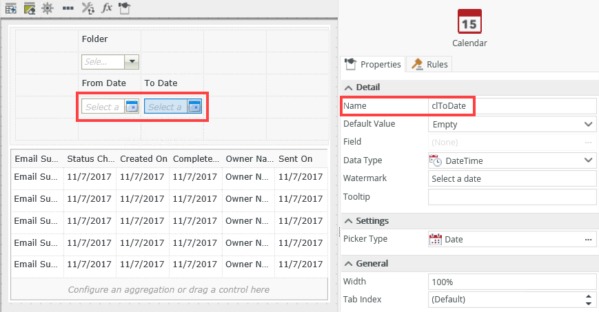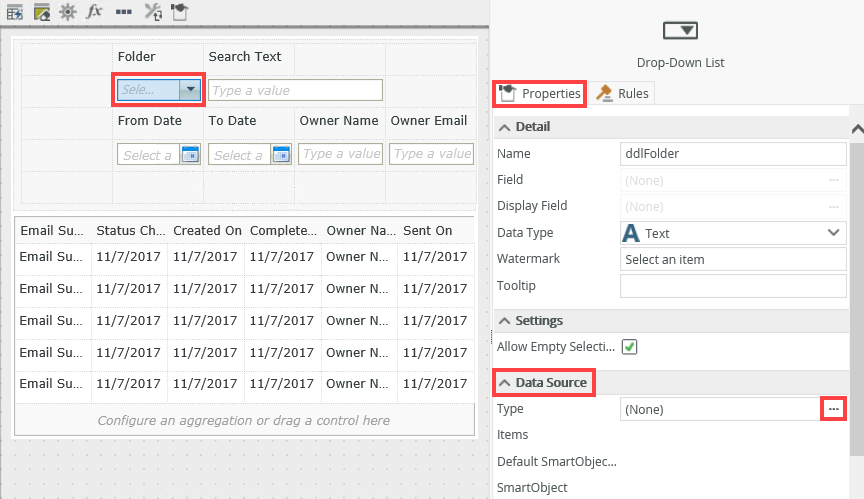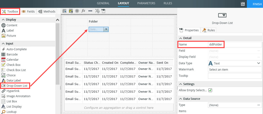 - Drag a Drop-Down List control onto the canvas. The control is available in the Input section of the Toolbox. Change the Drop-Down List control name to ddlFolder (in the Name field).