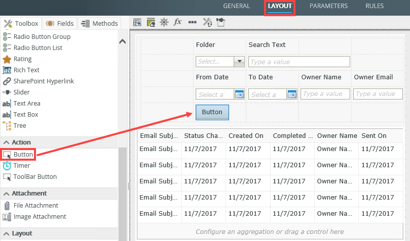 - Select the Layout tab. Drag a Button control onto the canvas. The control is available in the Action section of the Toolbox.