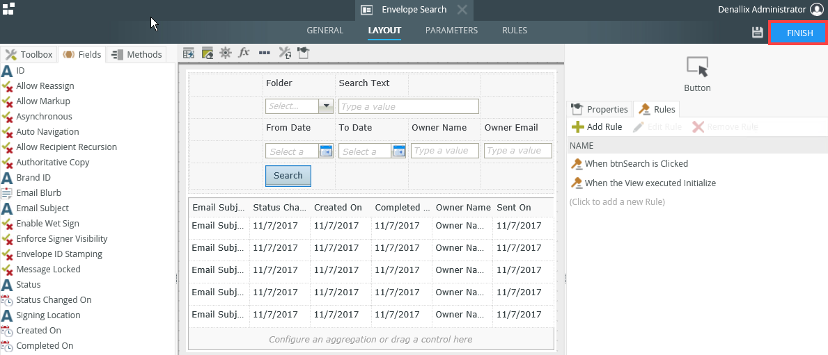 - On the Execute the List Method page, expand the Envelope Search in the context browser and drag the Controls > ddlFolder > Folder > ID property into the Folder ID parameter. Click Finish.