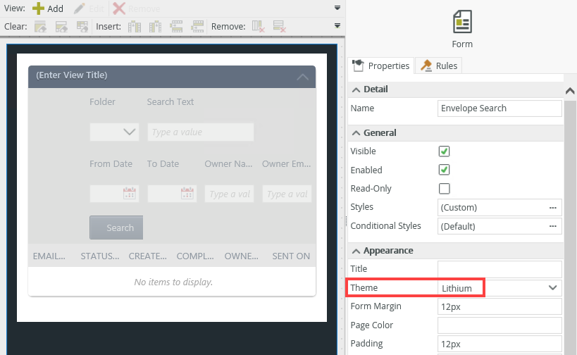 To change to the Lithium theme, you need to edit the form and navigate to the Theme property found under the Appearance heading and select Lithium.