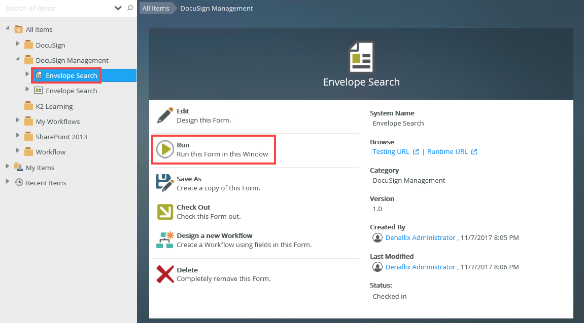 Use the custom DocuSign envelope list search filter to create a specific search for envelopes received, sent, drafted and deleted based on the folders within DocuSign. DocuSign only returns envelopes used in the last 30 days. To show envelopes older than 30 days, you must create a custom search filter with parameters to specify a date range. You generate the custom search filter using the DocuSign Envelope SmartObject list method which, as configured here, returns envelope activity for a specific time period.