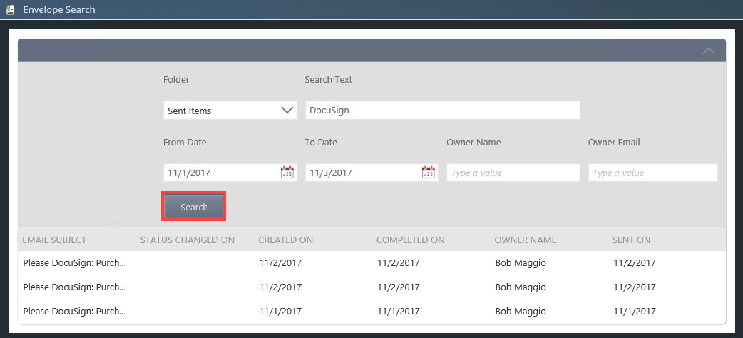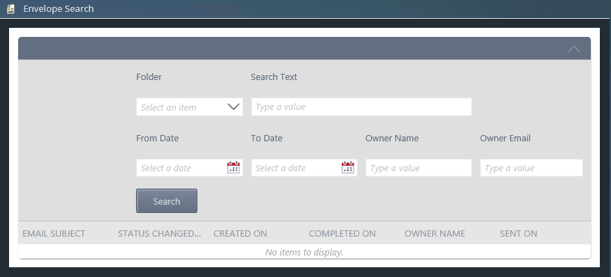 The following table explains the available options:Search Option Explanation Folder Use this drop down to select the Folder Property. Search Text Use this field to type additional details to refine your search. From Date and To Date Use the date fields to set a date parameter. Owner Name Use this field to specify a user within the DocuSign environment. Owner Email Use this field to specify a user email within the DocuSign environment. - Select and type values to build your search, and then click the Search button.