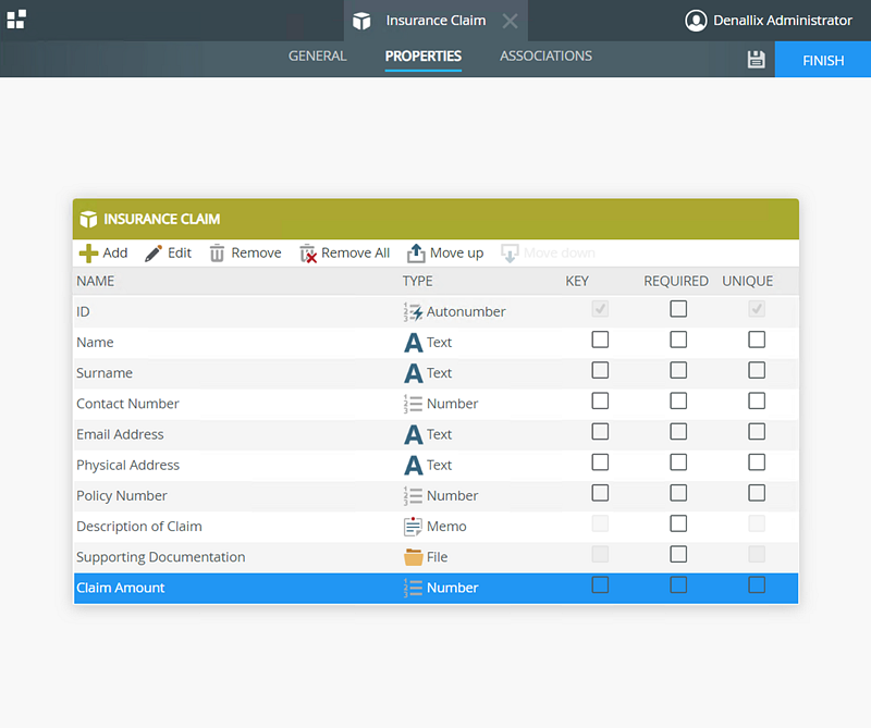 Click Finish.Property Name Type Key Required Unique ID Autonumber Yes No Yes Name Text No No No Surname Text No No No Contact Number Number No No No Email Address Text No No No Physical Address Text No No No Policy Number Number No No No Description of Claim Memo No No No Supporting Documentation File No No No Claim Amount Number No No No
