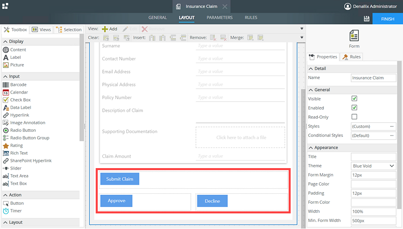 - Add three buttons to the form called Submit Claim, Approve, and Decline