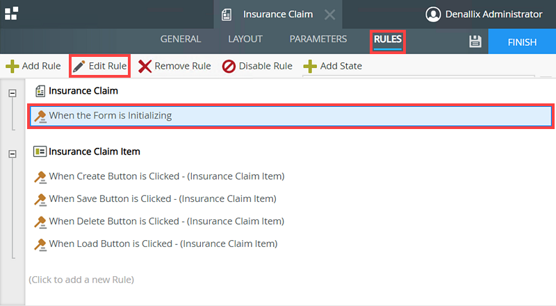 - Edit the Insurance Claim form and navigate to the Rules tab to edit the When Form is Submitting rule.